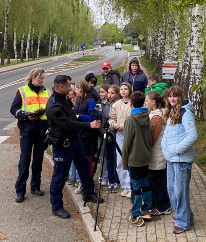 Am Freitag, den 24. April 2026, waren die Polizistin Tina Alius und der Polizist Marco Neumann in der Grundschule Hausdorf. Sie haben mit den Kindern mit Hilfe eines Lasergerätes die Geschwindigkeit der vorbeifahrenden Autos überprüft. Viele Autofahrer haben eine „Dankekarte“ erhalten, da sie sich an das Tempolimit 30 hielten. Die anderen bekamen die „gelbe Karte“